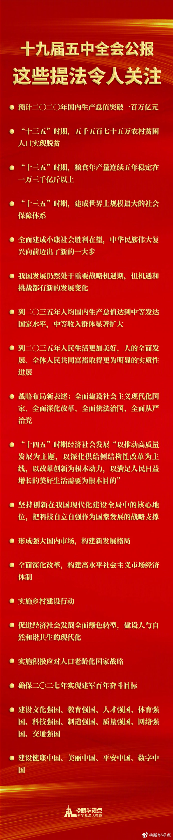 面向未來,全會及其通過的建議擘畫了中國未來5年以及15年的發展新藍圖,宣示了以習近平同志為核心的黨中央帶領全黨全國各族人民同心同德、頑強奮斗,奪取全面建設社會主義現代化國家新勝利的堅定決心。