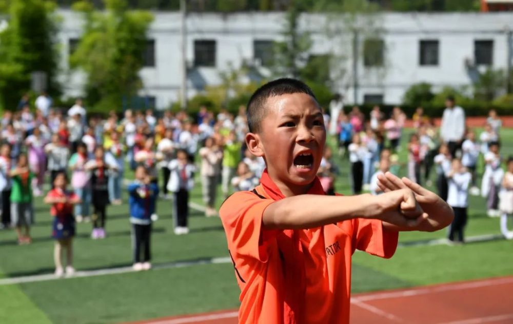 9月8日,在陜西平利老縣鎮中心小學的操場上,學生沈首洋(前)在大課間武術操上領操。新華社記者 李一博 攝