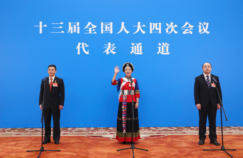 2021年3月8日,第十三屆全國人民代表大會第四次會議舉行第二場“代表通道”采訪活動。這是全國人大代表楊震生(左)、范永貞(中)、齊嵩宇通過網絡視頻方式接受采訪。新華社記者 張玉薇 攝