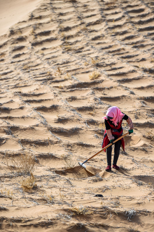 2020年4月2日,工人在阿拉善左旗騰格里沙漠種植花棒。新華社記者 連振 攝