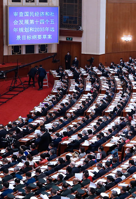 2021年3月5日,人民大會堂,十三屆全國人大四次會議開幕,根據這份建議編制、厚達142頁的“十四五”規劃和2035年遠景目標綱要草案呈現在代表面前,提請大會審查。