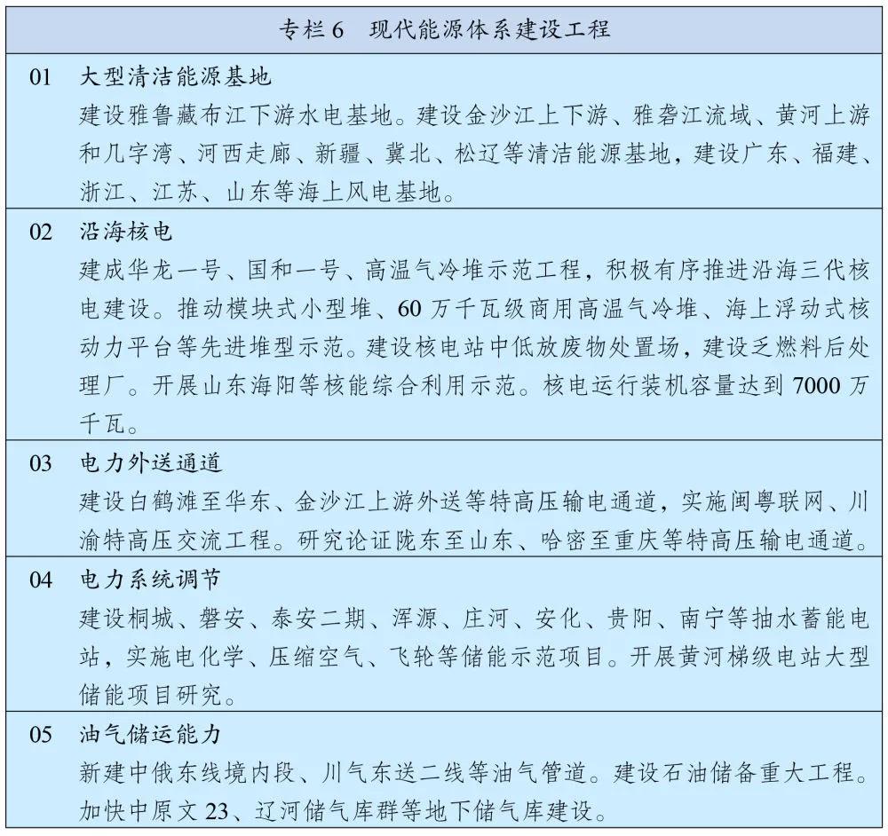 現代能源體系建設工程 有序發展海上風電,加快西南水電基地建設,安全穩妥推動沿海核電建設。 建設一批多能互補的清潔能源基地,非化石能源占能源消費總量比重提高到20%左右。