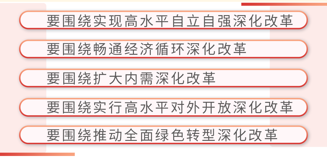 今年春節(jié)后、兩會前,習(xí)近平總書記在中央深改委會議上強調(diào),要發(fā)揮改革在構(gòu)建新發(fā)展格局中關(guān)鍵作用。會議還提出了“五個圍繞”——“要圍繞實現(xiàn)高水平自立自強深化改革”,比如大家熱議的解決“卡脖子”問題,發(fā)揮新型舉國體制的作用等等,都屬于這一部分;“要圍繞暢通經(jīng)濟循環(huán)深化改革”;“要圍繞擴大內(nèi)需深化改革”,包括區(qū)域協(xié)調(diào)、城鄉(xiāng)融合、土地制度改革、戶籍制度改革,健全再分配機制等;“要圍繞實行高水平對外開放深化改革”;“要圍繞推動全面綠色轉(zhuǎn)型深化改革”。