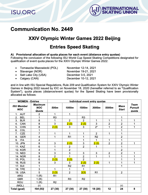 北京冬奧會速度滑冰女子項目席位分配情況。圖/國際滑聯(lián)官網(wǎng) 速度滑冰女子項目分為500米、1000米、1500米、3000米、5000米、集體出發(fā)以及團體追逐7個小項,共有104個參賽席位,速度滑冰項目的霸主荷蘭隊拿到全部17個席位。4站世界杯,中國速度滑冰女隊表現(xiàn)不俗,總計斬獲14個席位,實現(xiàn)全項目參賽,其中1000米、1500米、集體出發(fā)3個小項拿到滿額參賽席位。
