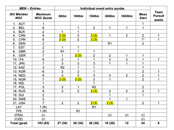 北京冬奧會速度滑冰男子項目席位分配情況。圖/國際滑聯(lián)官網(wǎng) 速度滑冰男子項目分為500米、1000米、1500米、5000米、10000米、集體出發(fā)以及團體追逐7個小項,共有103個參賽席位,荷蘭速度滑冰男隊同樣拿滿17個席位。除了5000米、10000米兩個長距離項目,中國速度滑冰男隊拿到其余5個小項的參賽資格,總計8個參賽席位。 據(jù)國際滑聯(lián)介紹,北京冬奧會速度滑冰項目的參賽席位并未最終確定。以中國速度滑冰隊為例,在女子500米、5000米以及男子500米、1500米4個小項上,由于順位靠前,如果有其他隊伍的運動員無法參賽,中國運動員仍有機會遞補參賽。 此外,國家體育總局冬季運動管理中心今天發(fā)布公告,經(jīng)研究決定,寧忠?guī)r、高亭宇兩位中國男子速滑名將已經(jīng)獲得北京冬奧會參賽資格。結(jié)合國際滑聯(lián)公布的參賽席位,其余4名男運動員、8名女運動員將通過中國速度滑冰隊的內(nèi)部選拔產(chǎn)生。 北京冬奧會中國速度滑冰隊參賽席位 女子:500米(2個)、1000米(3個)、1500米(3個)、3000米(2個)、5000米(1個)、集體出發(fā)(2個)、團體追逐(1個) 男子:500米(2個)、1000米(2個)、1500米(2個)、集體出發(fā)(1個)、團體追逐(1個) 新京報記者 徐邦印 |