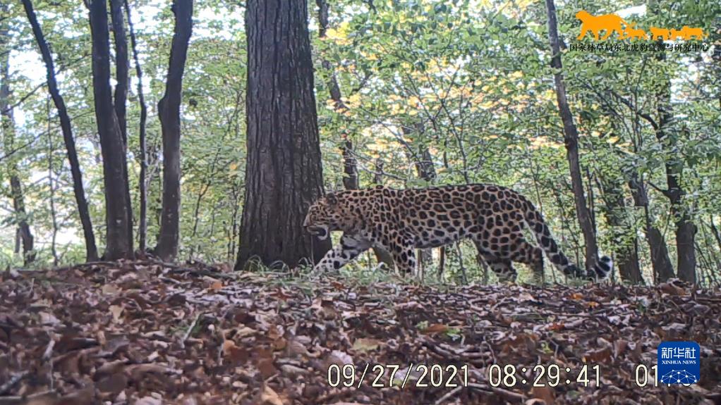 這是2021年9月27日利用“天地空一體化監測系統”在東北虎豹國家公園內監測到的野生東北豹影像(視頻截圖)。新華社發