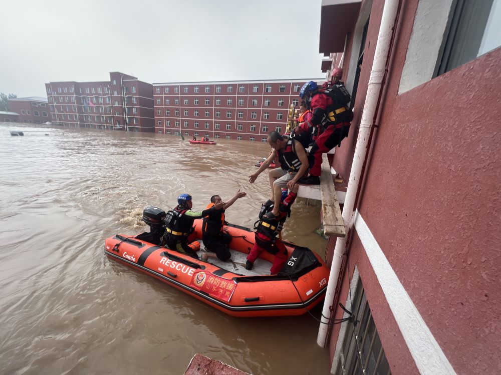 “對黨忠誠、紀(jì)律嚴(yán)明、赴湯蹈火、竭誠為民”,訓(xùn)詞錚錚,其心拳拳。 今年入汛以來,作為應(yīng)急救援的主力軍和國家隊,國家綜合性消防救援隊伍堅決貫徹落實習(xí)近平總書記重要指示精神和黨中央、國務(wù)院決策部署,聞警即動、沖鋒在前。一個個橙色身影迎風(fēng)而立、迎水而擊,以實際行動踐行訓(xùn)詞精神,在災(zāi)區(qū)筑起一道道堅不可摧的橙色“大壩”。 雨聲就是哨聲,汛情就是號令。 洪水侵襲河北涿州,8月2日晚,靖雅學(xué)校內(nèi)1400余名村民被困。圍墻開始倒塌,大水灌進教室,朝著二樓漫去。警情驟增,河北、山東消防救援隊伍接令緊急馳援。 洪水湍急,救援艇無法靠近樓體。“人命關(guān)天!黨員跟我一起先跳!”唐山市消防救援支隊消防員周恒和隊員們相繼跳入激流,涉水泅渡,奮力將導(dǎo)向繩系在樓體上,開辟出一條條救援通道。 教學(xué)樓窗臺和救援艇有一米多的高度差,濟南市消防救援支隊消防員曹博源上前半蹲馬步、雙手緊緊抓住窗臺,以肩為梯、以背為橋,用身體架起一座堅實的“人梯”,讓被困群眾踩著他的肩背登上舟艇。