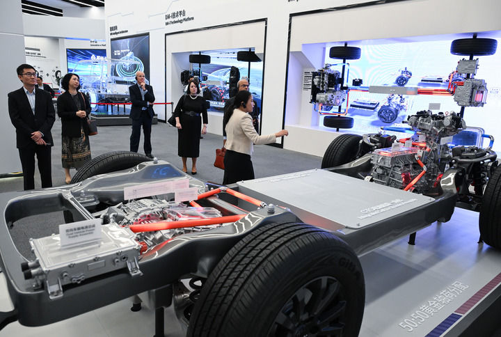 外賓在位于深圳市坪山區的比亞迪全球總部展廳參觀(2024年7月22日攝)。新華社記者 李賀 攝