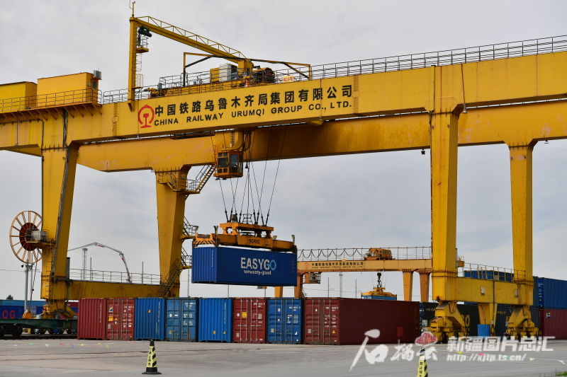 5月29日,霍爾果斯站內,工作人員操作龍門吊車在吊裝集裝箱。關擁軍攝