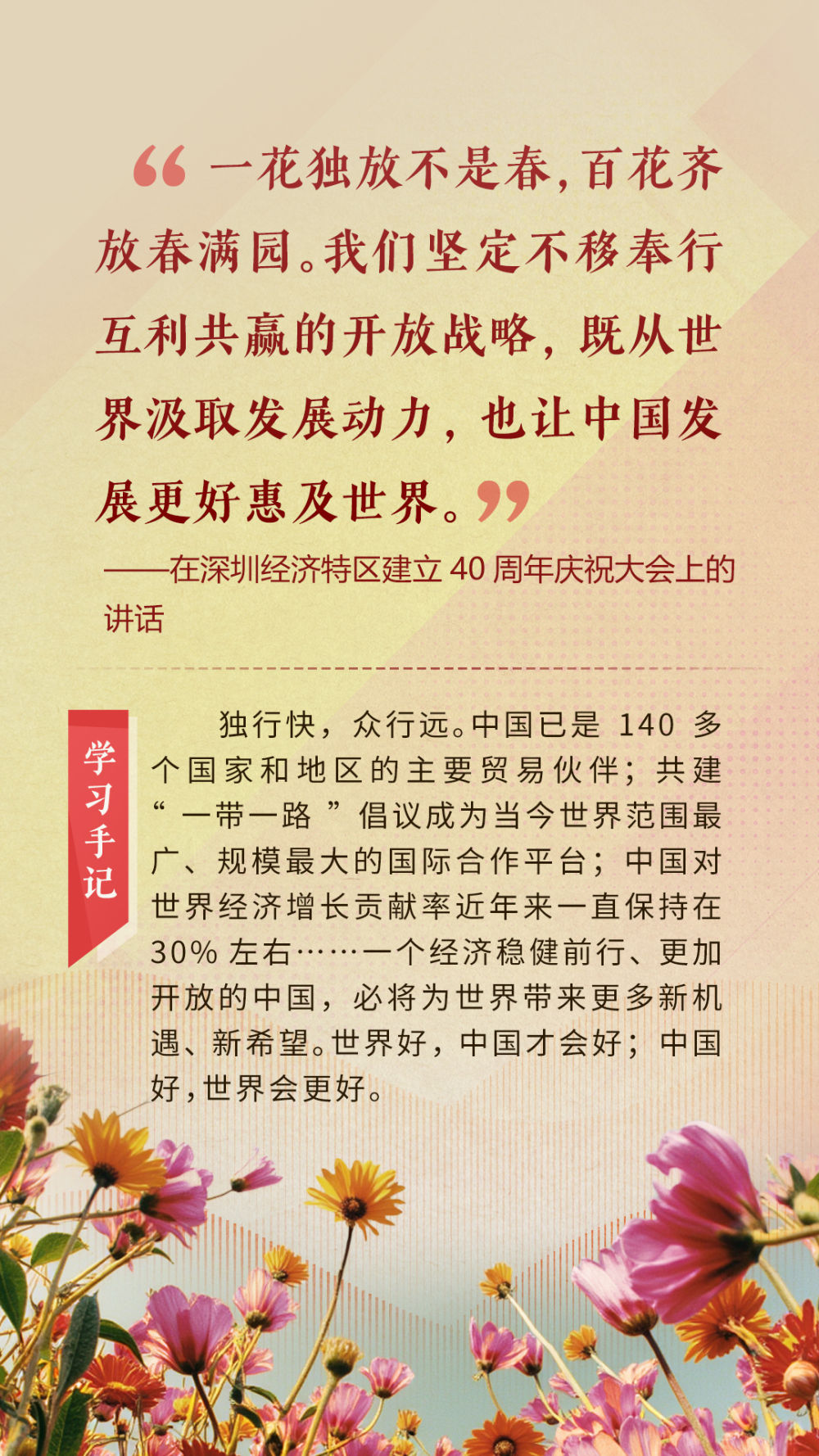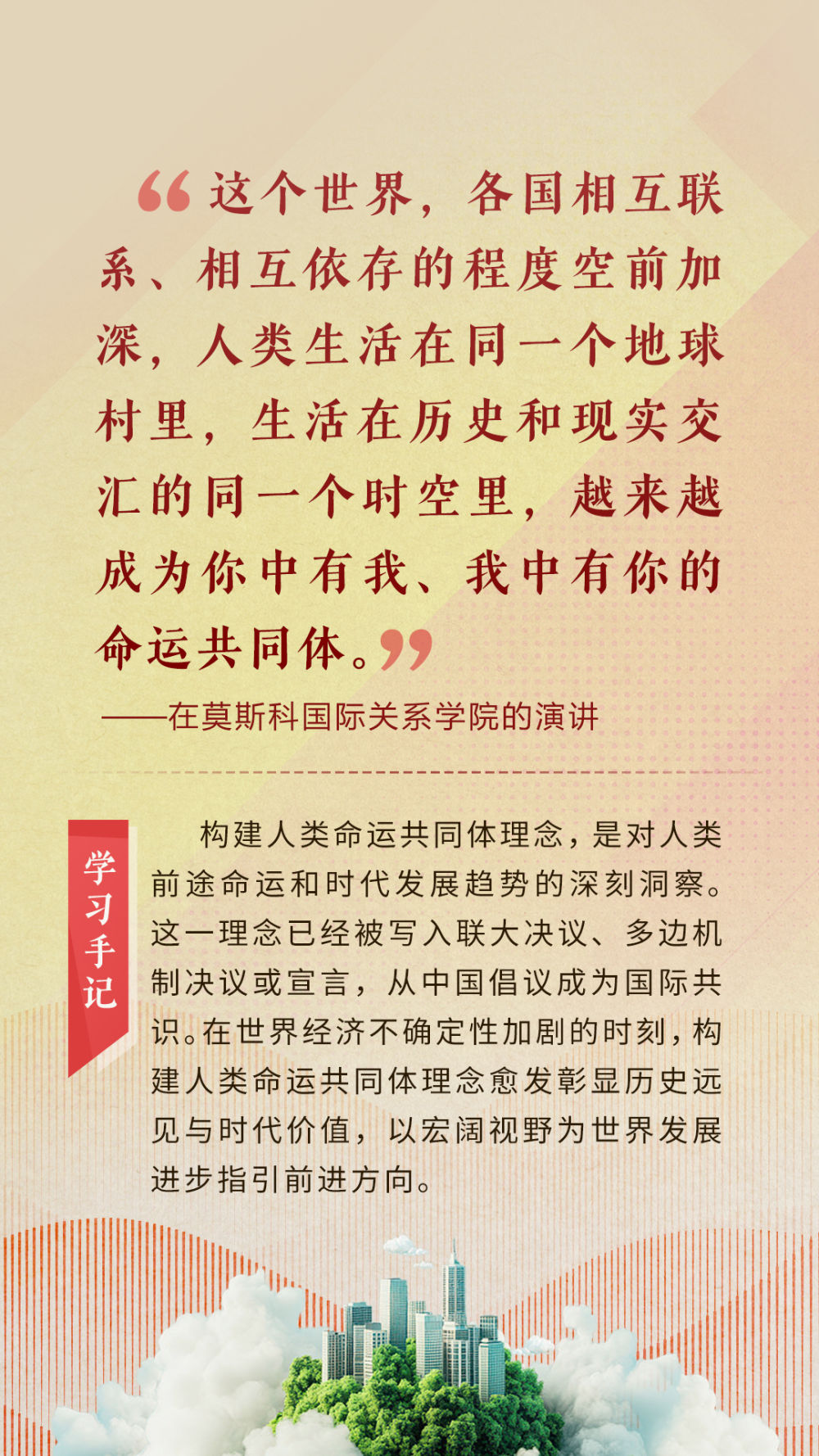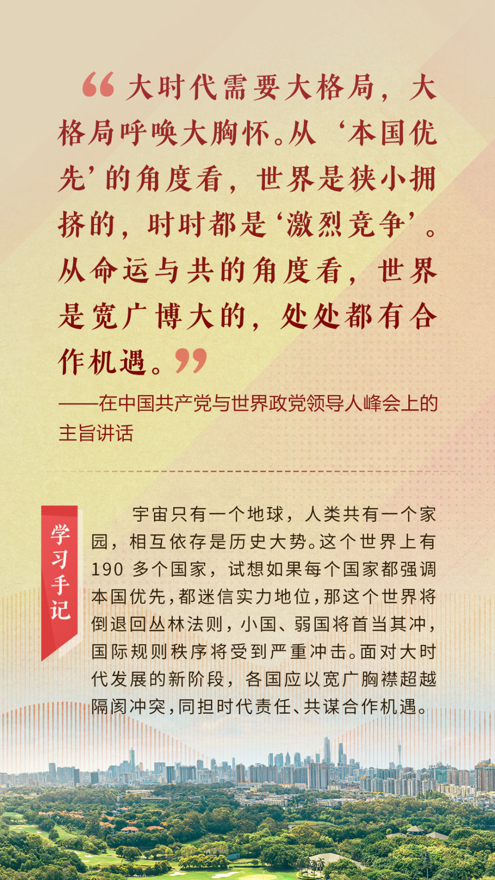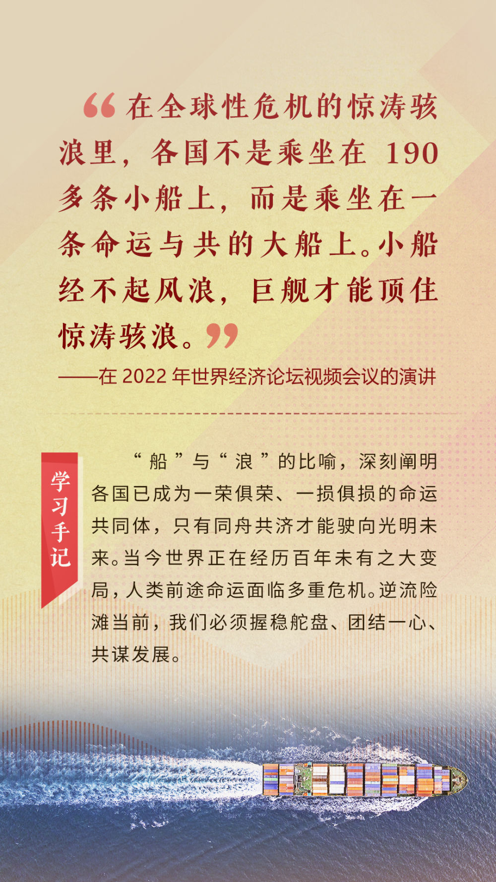 “天空足夠大,地球足夠大,世界也足夠大,容得下各國共同發(fā)展繁榮”“你中有我、我中有你的命運共同體”“與中國同行就是與機遇同行”……習近平總書記一次次在重要場合發(fā)表重要講話,指引我們站在歷史正確的一邊,站在人類進步的一邊,不畏浮云、登高望遠,不懼風浪、勇毅前行。