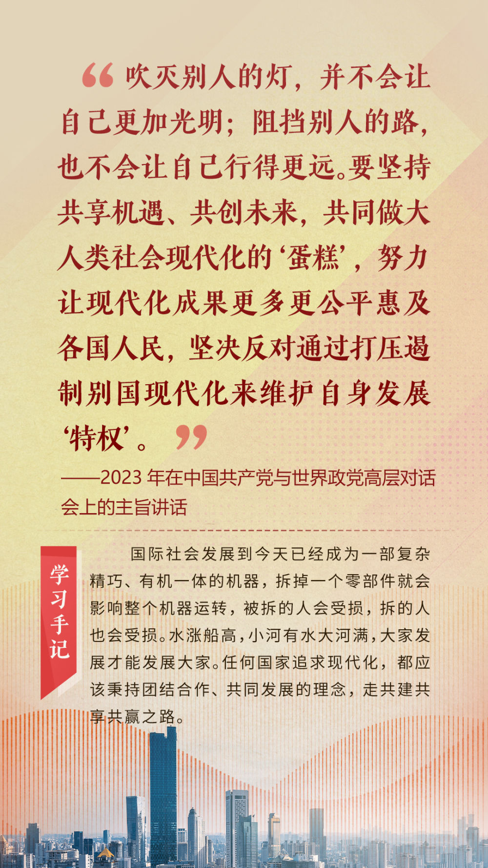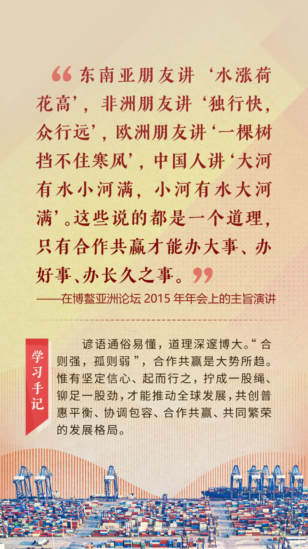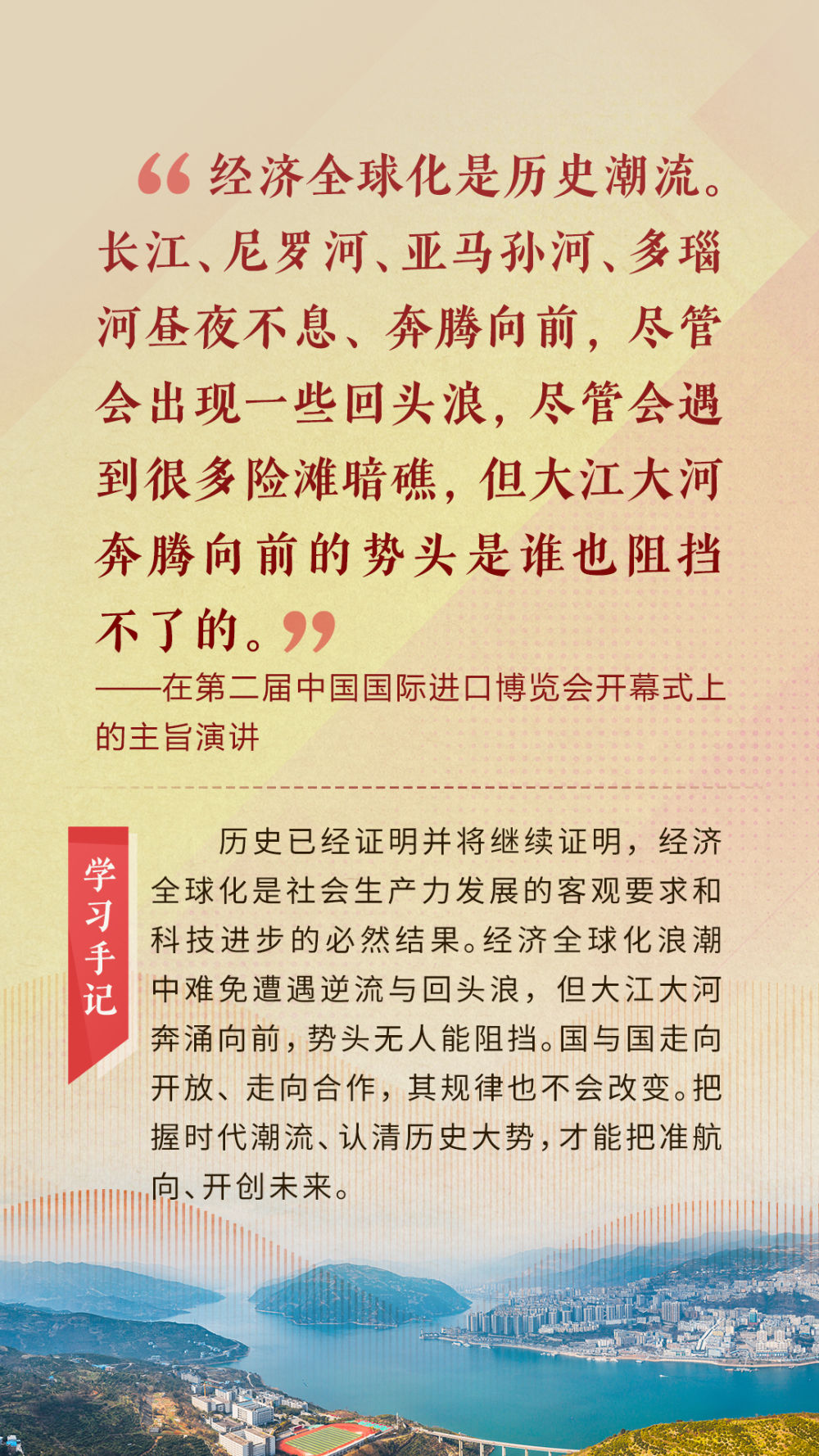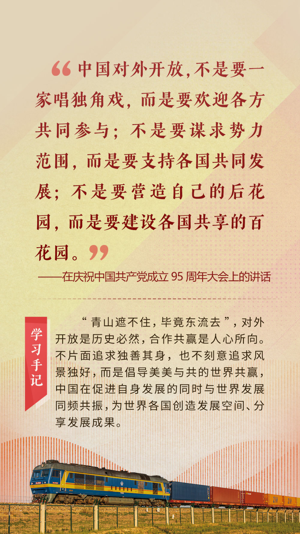 “天空足夠大,地球足夠大,世界也足夠大,容得下各國共同發(fā)展繁榮”“你中有我、我中有你的命運共同體”“與中國同行就是與機遇同行”……習近平總書記一次次在重要場合發(fā)表重要講話,指引我們站在歷史正確的一邊,站在人類進步的一邊,不畏浮云、登高望遠,不懼風浪、勇毅前行。