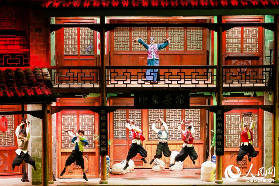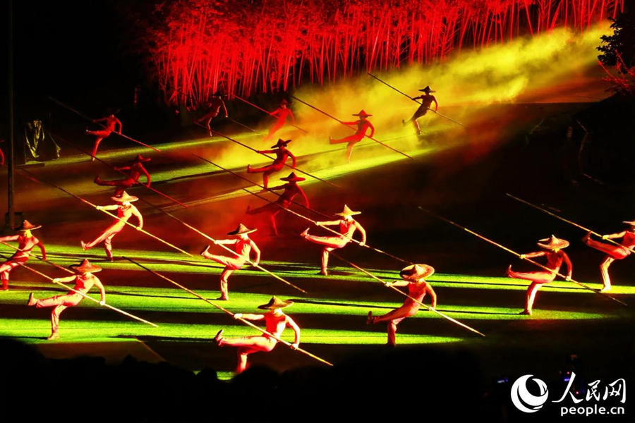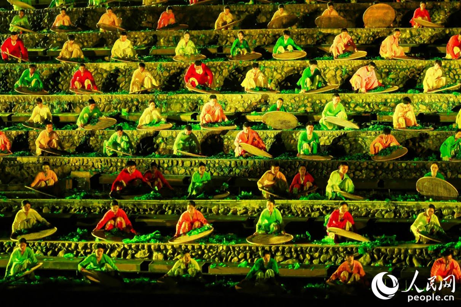 《印象大紅袍》演出將傳統技藝與現代舞美技術相融合,融入武夷茶農搖青的場景。人民網 李唯一攝
