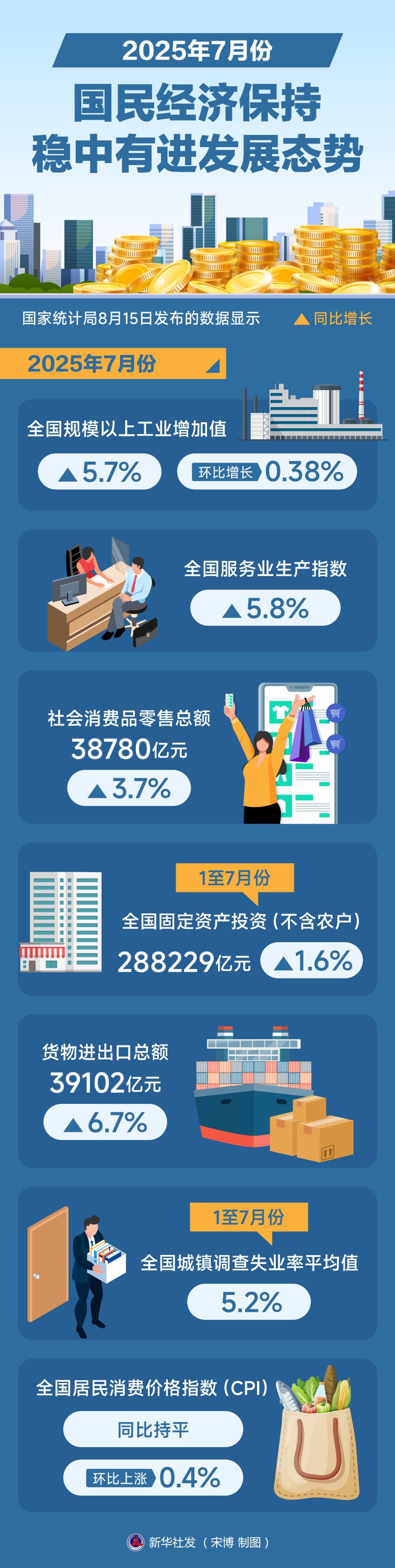 國家統計局8月15日發布的數據顯示,2025年7月份,國民經濟保持穩中有進發展態勢,生產需求持續增長,就業物價總體穩定,新質生產力培育壯大,高質量發展取得新成效。