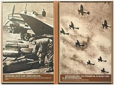 中國人民抗日戰(zhàn)爭紀(jì)念館中展示的蘇聯(lián)援華航空隊(duì)老照片。左側(cè)照片為蘇聯(lián)援華航空隊(duì)成員為飛機(jī)裝彈,準(zhǔn)備轟炸被日軍占領(lǐng)的臺北松山機(jī)場。右側(cè)照片為1938年中蘇空軍參加徐州會戰(zhàn)。