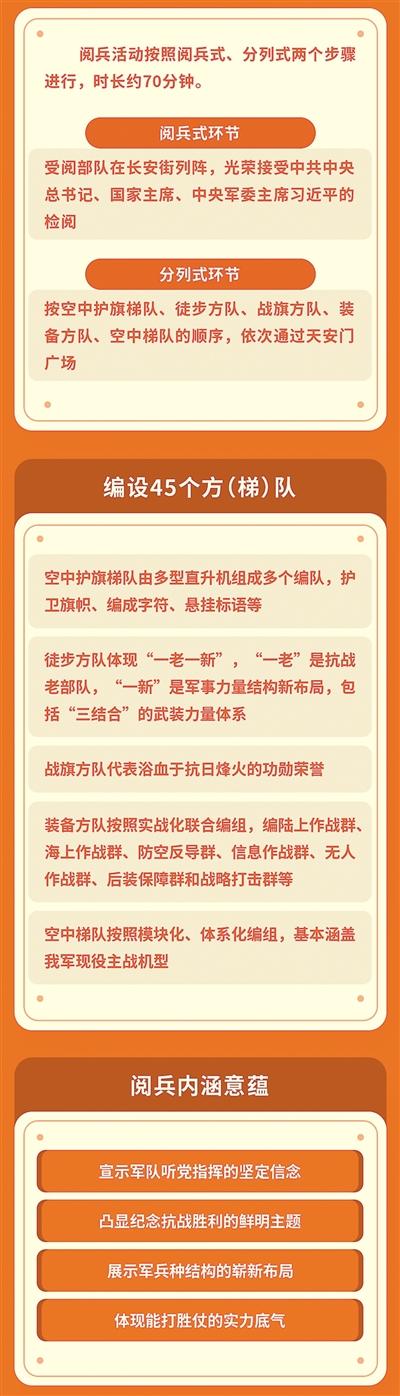 閱兵活動按照閱兵式、分列式兩個步驟進行,時長約70分鐘。閱兵式環節,受閱部隊在長安街列陣,光榮接受中共中央總書記、國家主席、中央軍委主席習近平的檢閱。分列式環節,按空中護旗梯隊、徒步方隊、戰旗方隊、裝備方隊、空中梯隊的順序,依次通過天安門廣場。