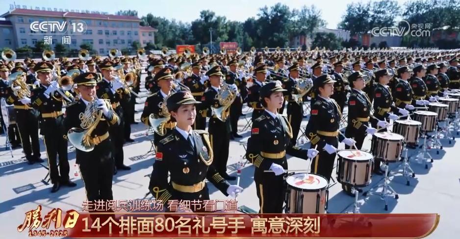 本次聯(lián)合軍樂團(tuán)在演奏隊(duì)形的編排上,整體設(shè)置了14個(gè)排面,寓意14年抗戰(zhàn);前排設(shè)置了80名禮號(hào)手,寓意抗戰(zhàn)勝利80周年。