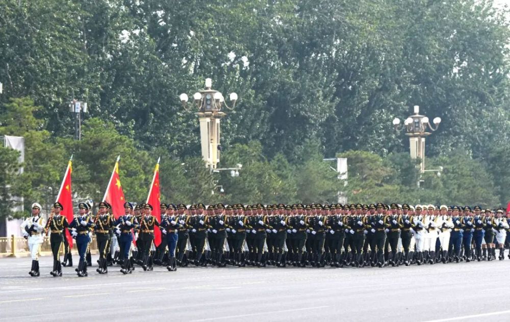 儀仗方隊護衛黨旗、國旗、軍旗,3日上午第一個走過天安門廣場,接受祖國和人民檢閱。