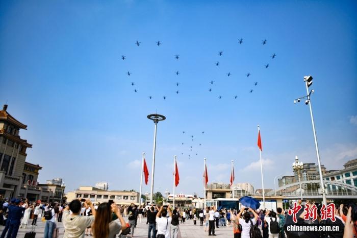 直升機組成巨大的“80”字樣。中新社記者 楊華峰 攝