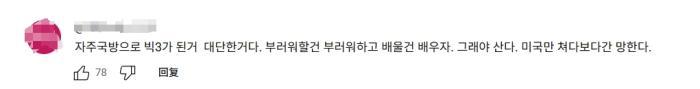 有韓國網友表示,對中國除了羨慕還是羨慕,韓國一定要向中國學習,如果(韓國)只看美國的眼色,就會"亡國"。