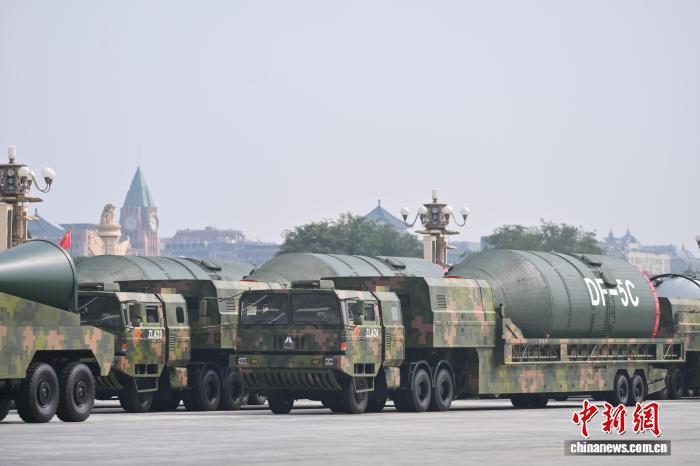 9月3日,紀念中國人民抗日戰爭暨世界反法西斯戰爭勝利80周年大會在北京隆重舉行。圖為核導彈第二方隊"東風-5C"液體洲際戰略核導彈駛過天安門廣場。 中新網記者 趙文宇 攝