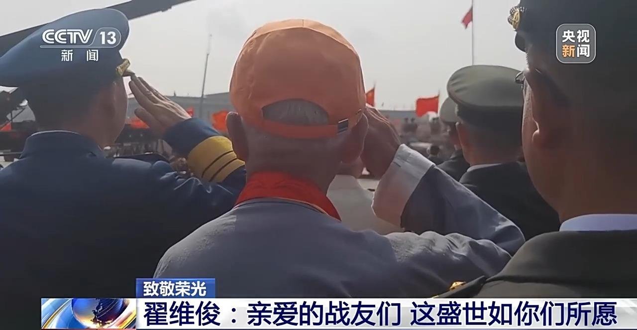 9月3日,當(dāng)精良武器裝備經(jīng)過天安門城樓接受檢閱時。觀禮臺上,99歲的支前模范翟維俊敬軍禮,向受閱方隊致敬。