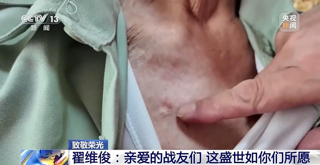 抗戰(zhàn)支前模范 翟維俊:我代替我們犧牲的戰(zhàn)友和同志們看到了這個和平盛世,也看到了我們新時代強(qiáng)大的新中國,我高興、自豪。 參加現(xiàn)場觀禮的幾天前,在北京朝陽區(qū)永安里的這間簡樸老屋內(nèi),我們見到了翟維俊,聽他講述親歷的烽火歲月。提起曾經(jīng)的戰(zhàn)斗經(jīng)歷,老人解開幾顆衣服扣子,右胸口一枚硬幣大小的傷疤赫然在目。
