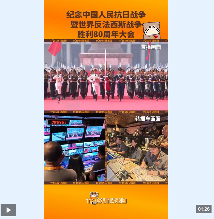 9月3日上午,紀(jì)念中國人民抗日戰(zhàn)爭(zhēng)暨世界反法西斯戰(zhàn)爭(zhēng)勝利80周年大會(huì)在北京天安門廣場(chǎng)隆重舉行,以盛大閱兵儀式,同世界人民一道紀(jì)念這個(gè)偉大的日子。 從人民英雄紀(jì)念碑,到五星紅旗升起的地方,從偉大勝利走向偉大復(fù)興。跟隨ToSun記者團(tuán)的鏡頭,看總臺(tái)直播團(tuán)隊(duì)如何切出閱兵式直播中讓人熱血澎湃的“中國排面”。 |