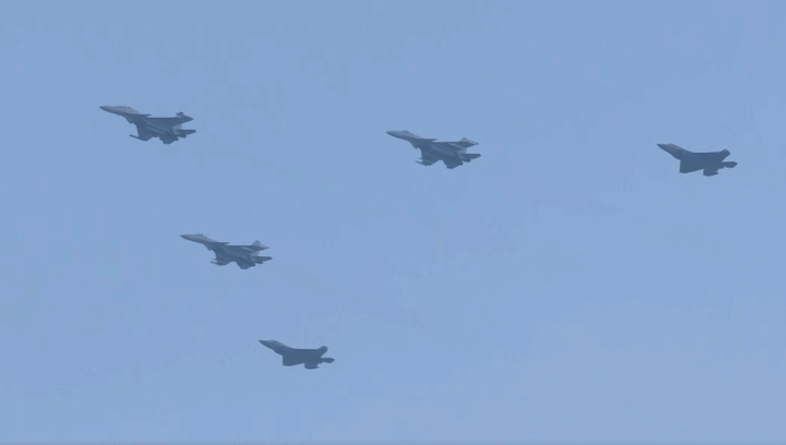 航母佩劍,刀尖舞者,殲-15DH、殲-15DT、殲-35和殲-15T編成兩個(gè)楔隊(duì)接受檢閱,從滑躍起飛到彈射出擊,從單一機(jī)型到多機(jī)協(xié)同,中國(guó)艦載機(jī)跨越發(fā)展,搏擊???。