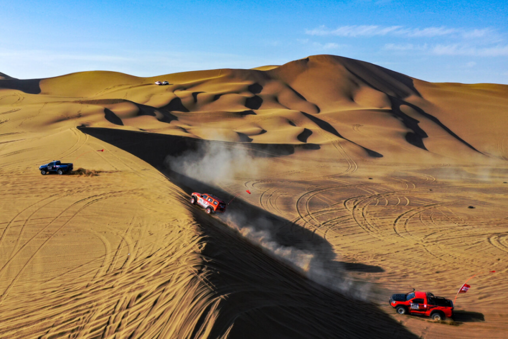 賽車在庫木塔格沙漠里馳騁(無人機照片)。周鵬 攝