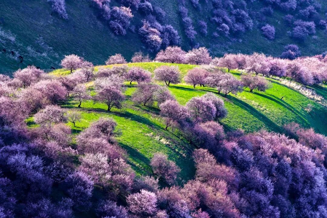 雪山下滿山遍野的杏花
