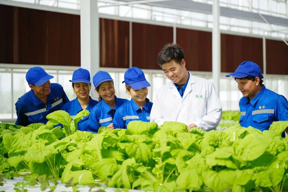 在新疆阿克蘇地區(qū)庫車市甬庫同心村智慧農(nóng)業(yè)植物工廠,技術(shù)人員在培訓(xùn)當?shù)氐霓r(nóng)業(yè)產(chǎn)業(yè)工人。
