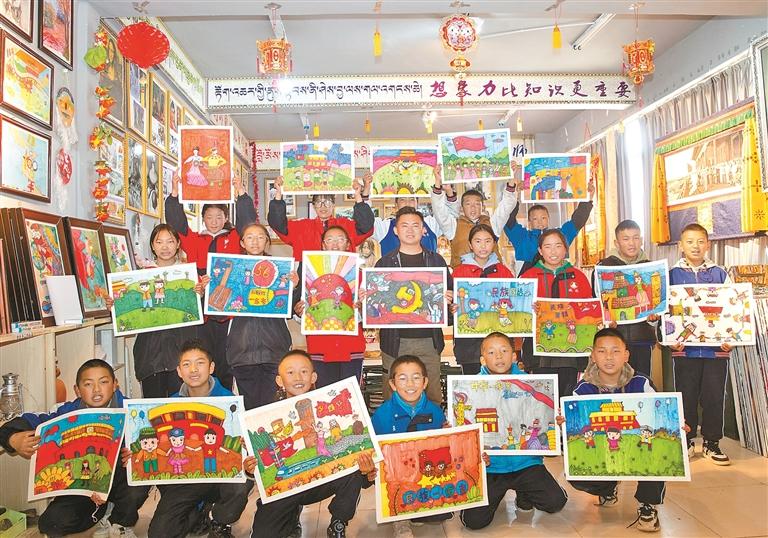 山南市桑日縣中學美術興趣社團的學生展示自己的以"鑄牢中華民族共同體意識"為主題的繪畫作品。記者 洛桑 通訊員 次仁龍布 攝