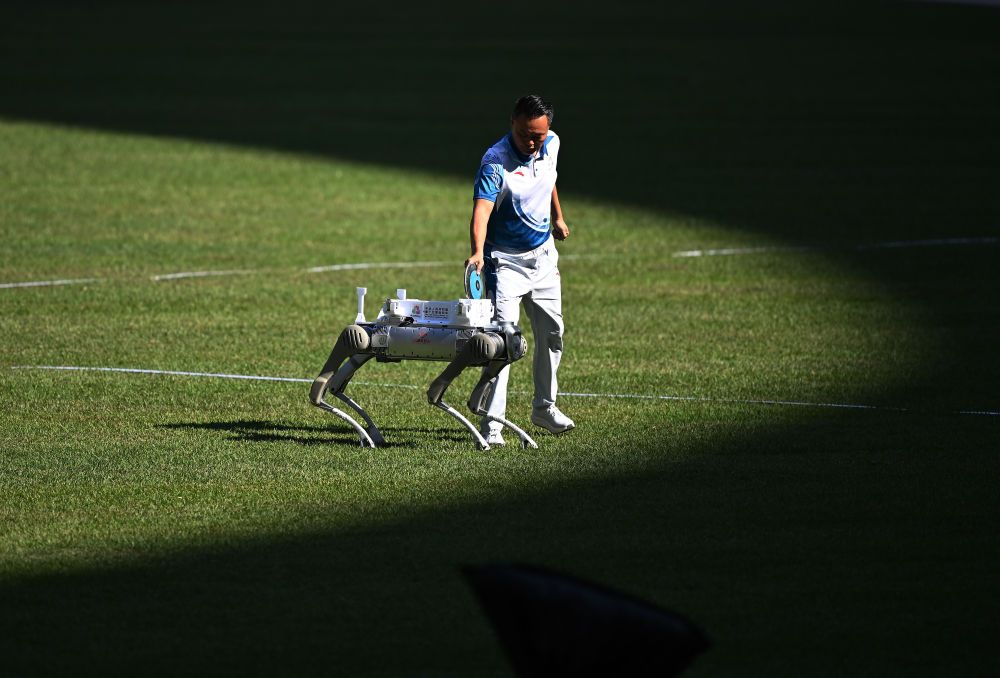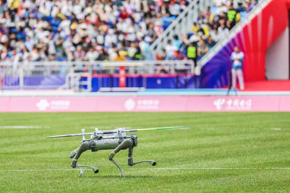 11月15日,機(jī)器狗在田徑項(xiàng)目女子標(biāo)槍及格賽中運(yùn)送標(biāo)槍。