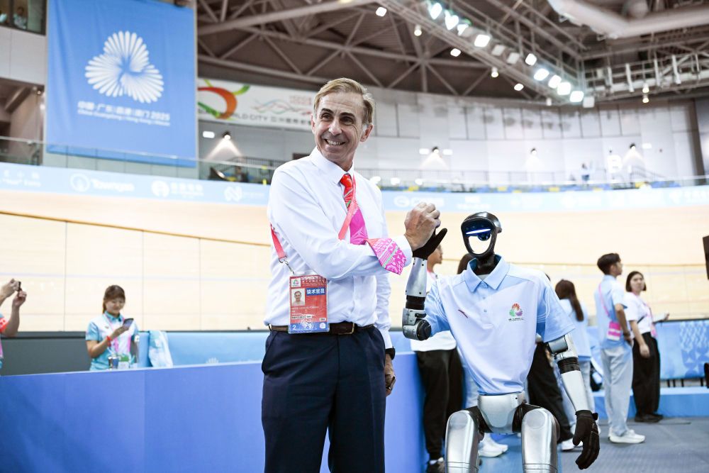 11月13日,一名賽事技術(shù)官員在場(chǎng)地自行車女子團(tuán)體競(jìng)速賽決賽前同參與表演的機(jī)器人擊掌合影。