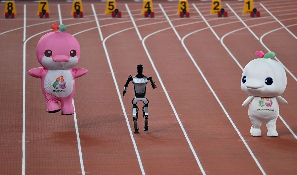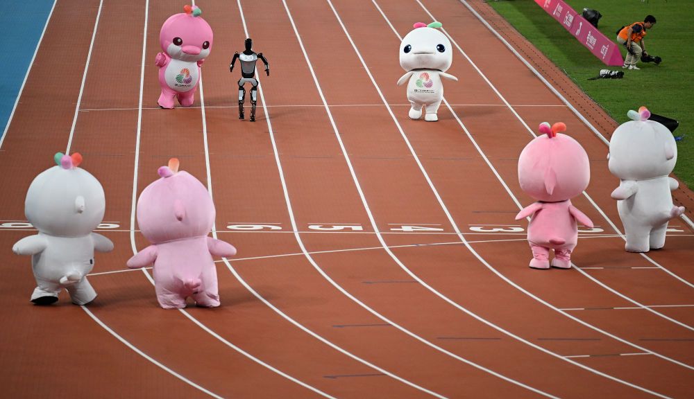 11月17日,在田徑項(xiàng)目賽事開(kāi)始前的暖場(chǎng)活動(dòng)中,機(jī)器人和吉祥物喜洋洋在廣東奧體中心體育場(chǎng)賽跑。