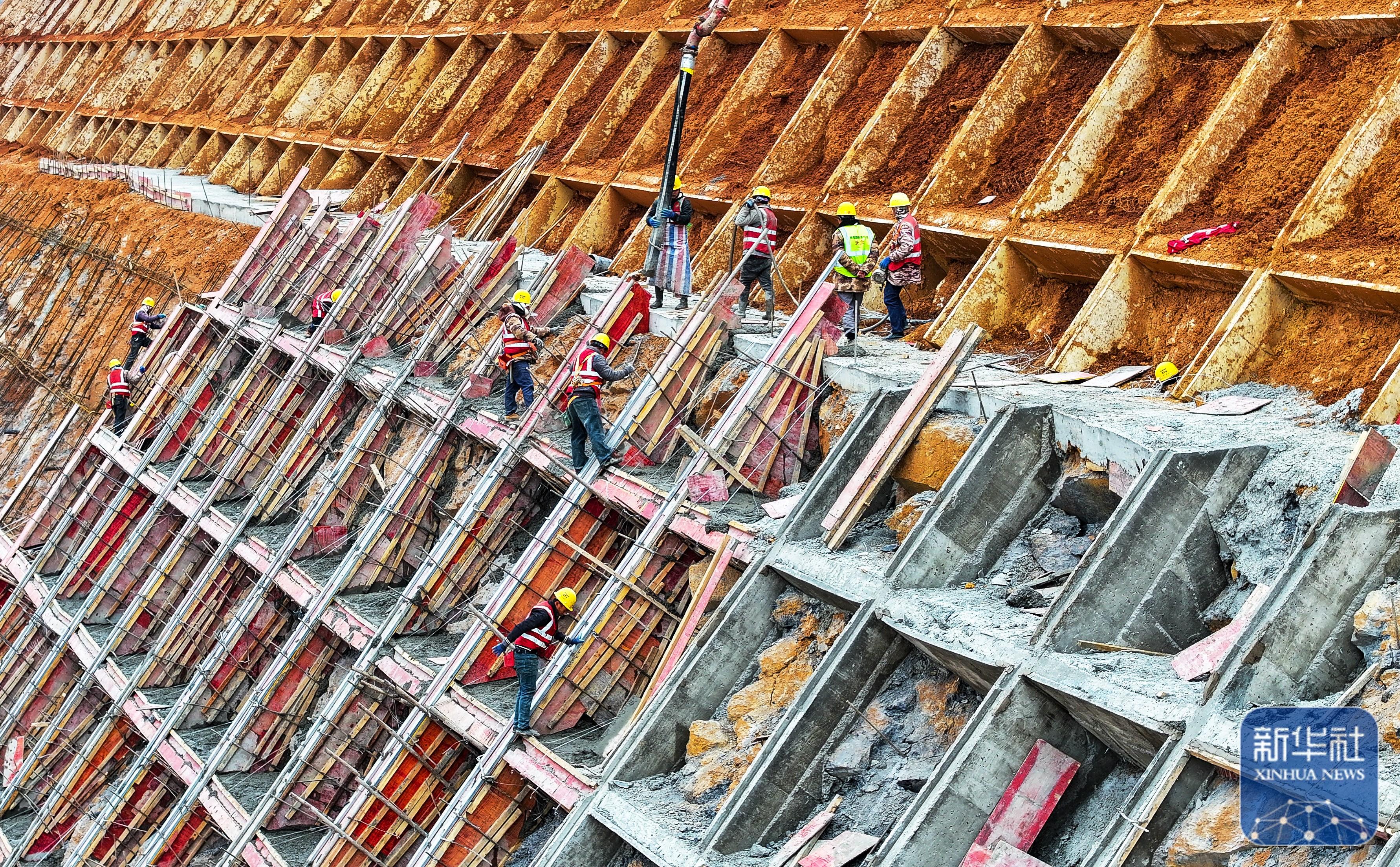 ↑ 1月2日,在位于湖南省永州市新田縣龍泉街道石甑源村的桂(東)新(田)高速建設工地,工人們進行防護坡施工作業(yè)(無人機照片)。新華社發(fā)(劉貴雄攝)