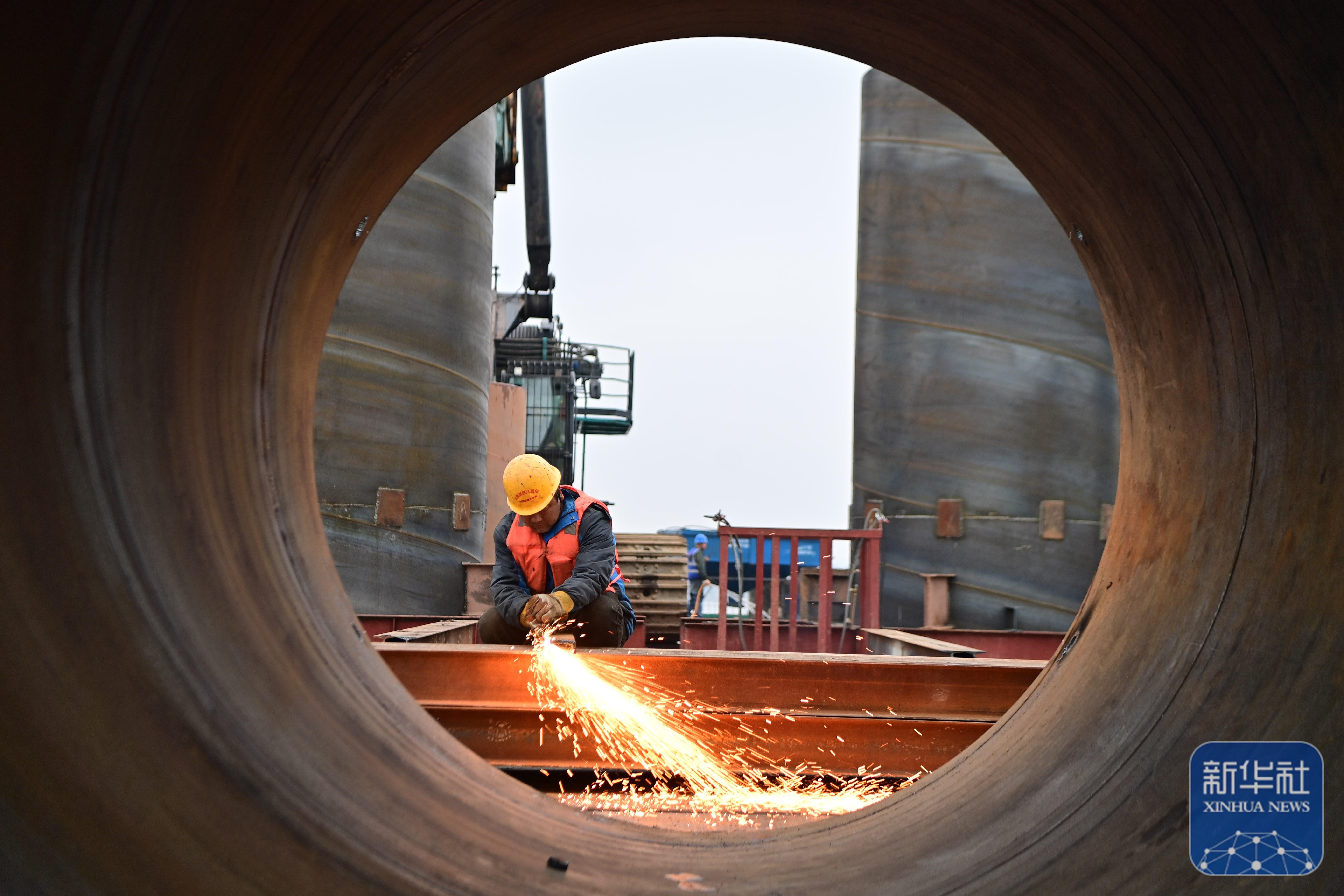 ↑ 1月2日,工人在位于江蘇省興化經(jīng)濟開發(fā)區(qū)的中建七局寧鹽高速泰州1標段鋼筋加工場進行焊接作業(yè)(無人機照片)。新華社發(fā)(周社根攝)