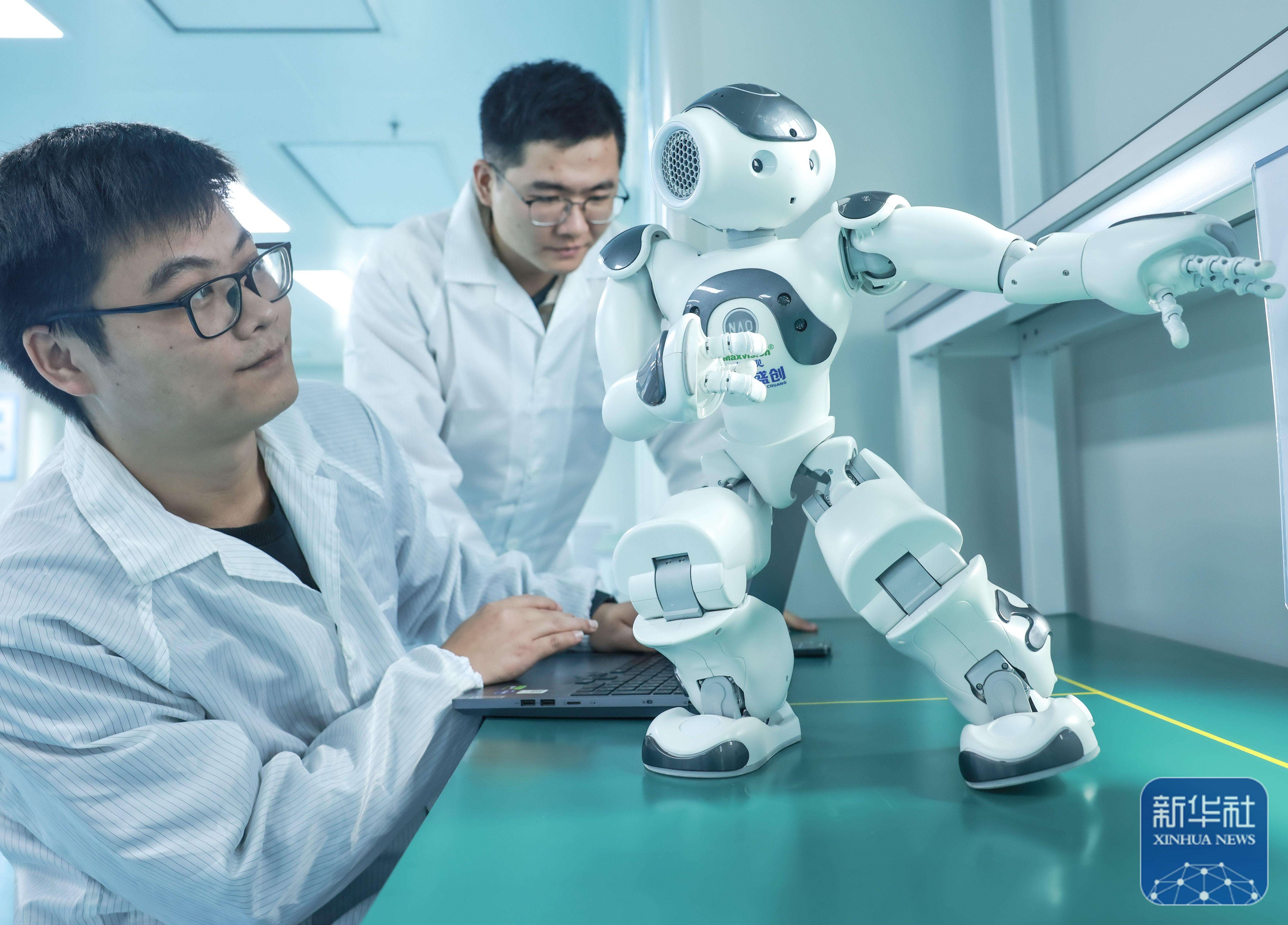 ↑ 1月5日,在盛視科技股份公司華中總部武漢研發中心,技術人員在調試人形機器人。新華社發(趙軍攝)