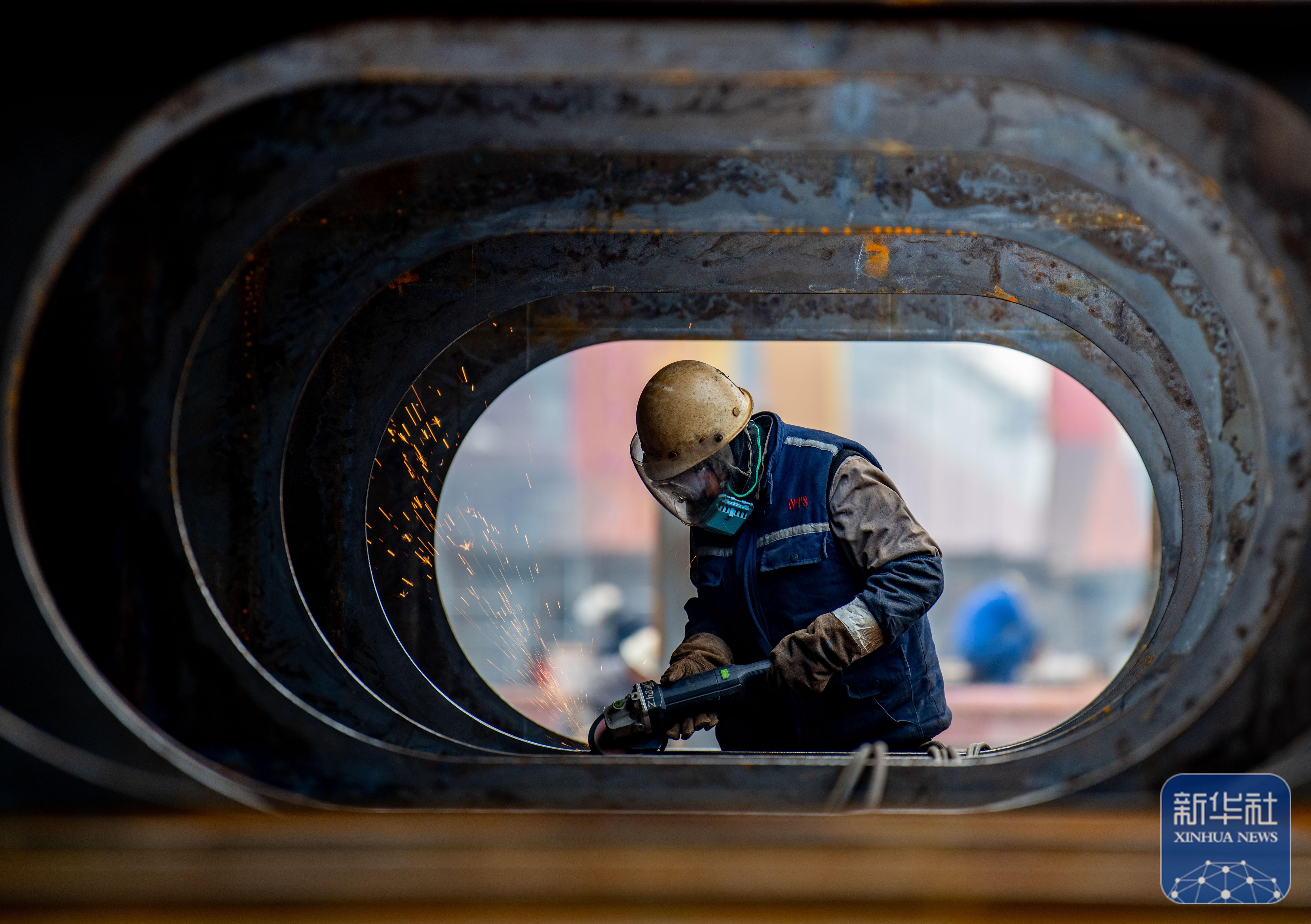 ↑ 1月5日,江蘇泰州口岸船舶有限公司廠區內,工人進行打磨作業。新華社發(楊玉崗攝)