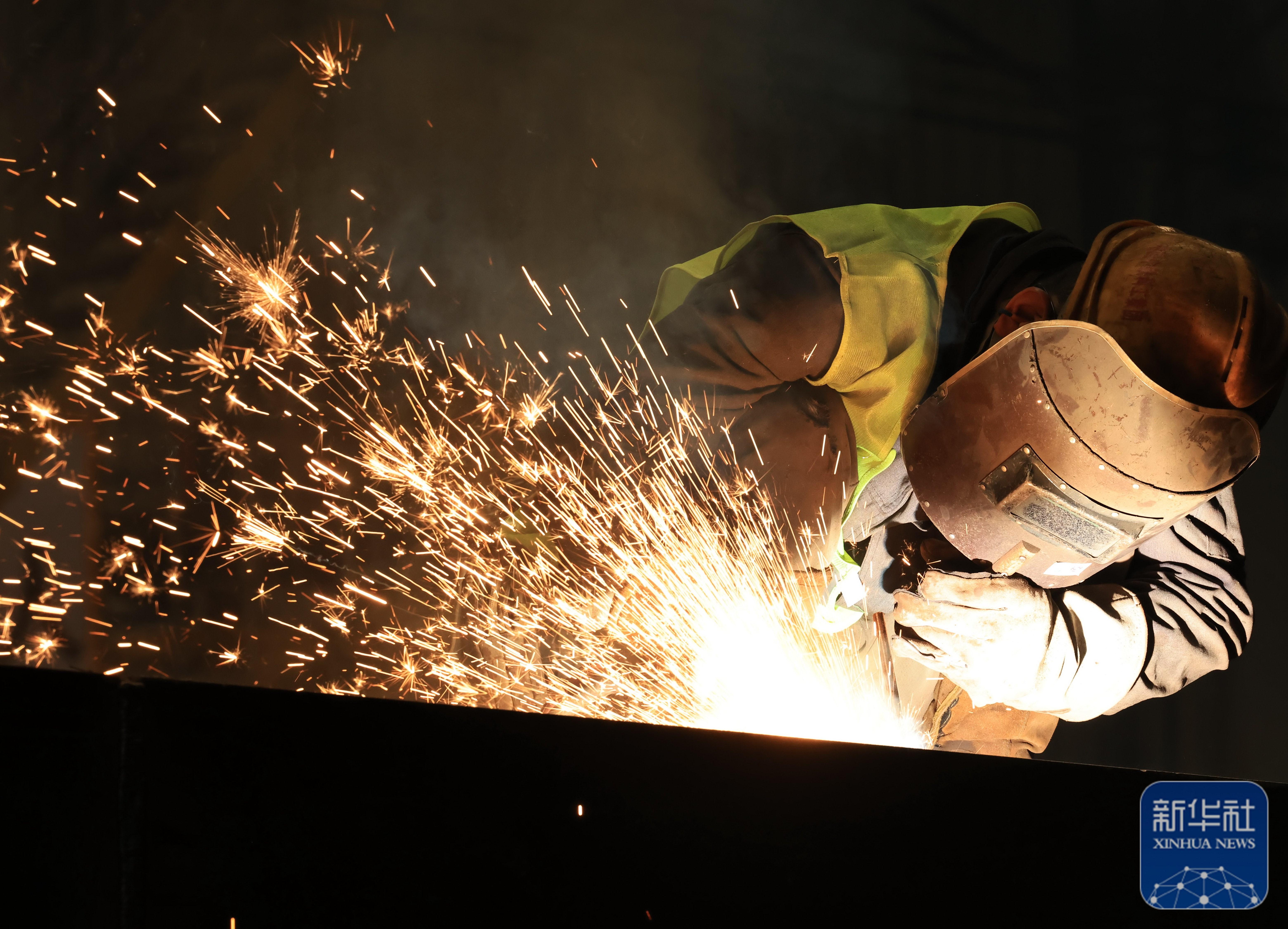 ↑ 1月5日,工人在河北省樂亭縣經濟開發區一家腳手架企業焊接車間工作。新華社發(劉滿倉 攝)