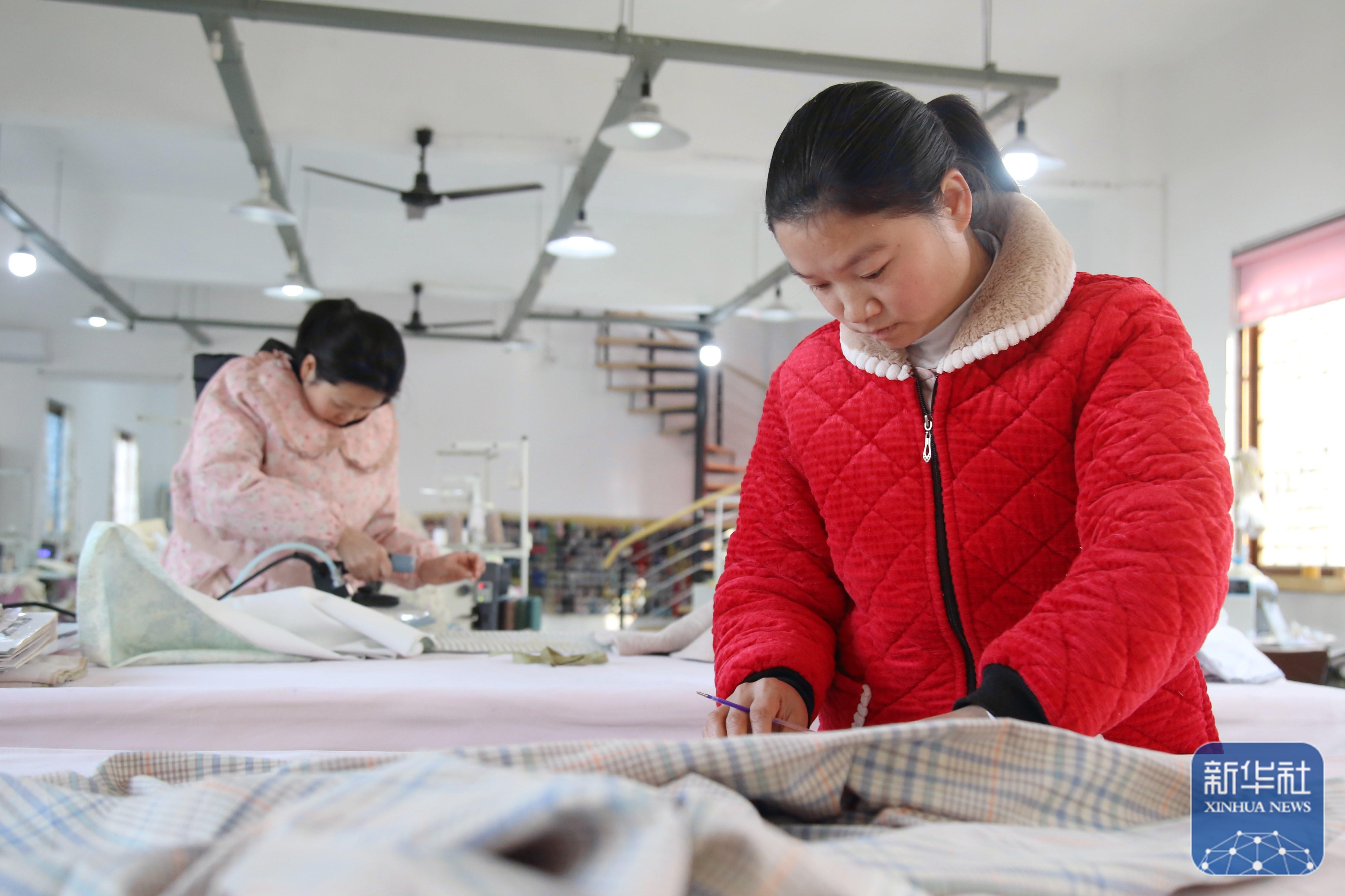 ↑ 1月5日,工人在湖北省十堰市鄖陽區柳陂鎮龍韻村一家布藝加工廠忙碌。新華社發(曹忠宏 攝)