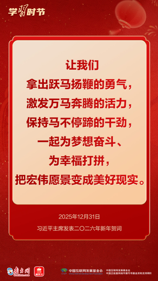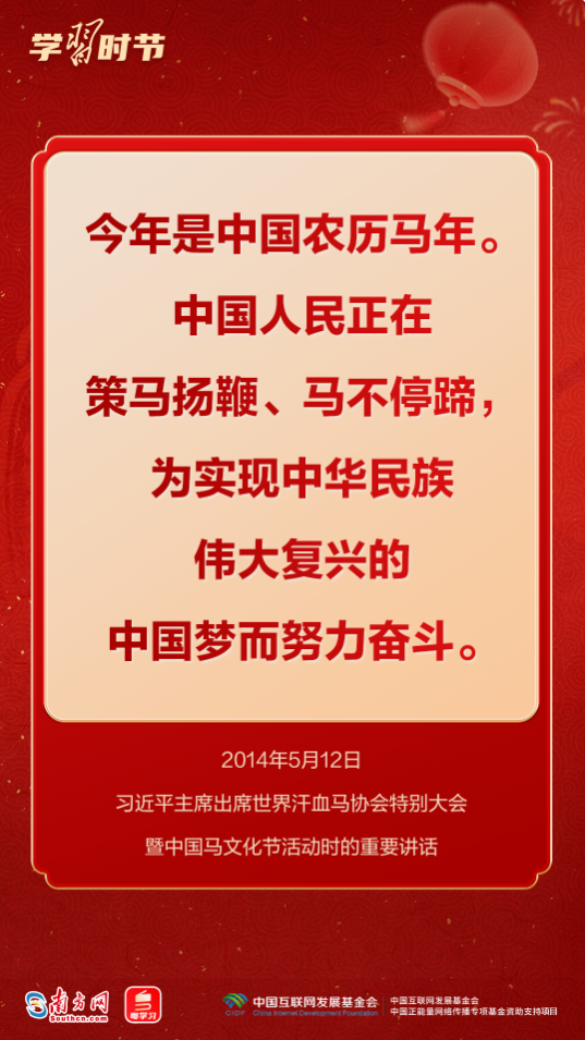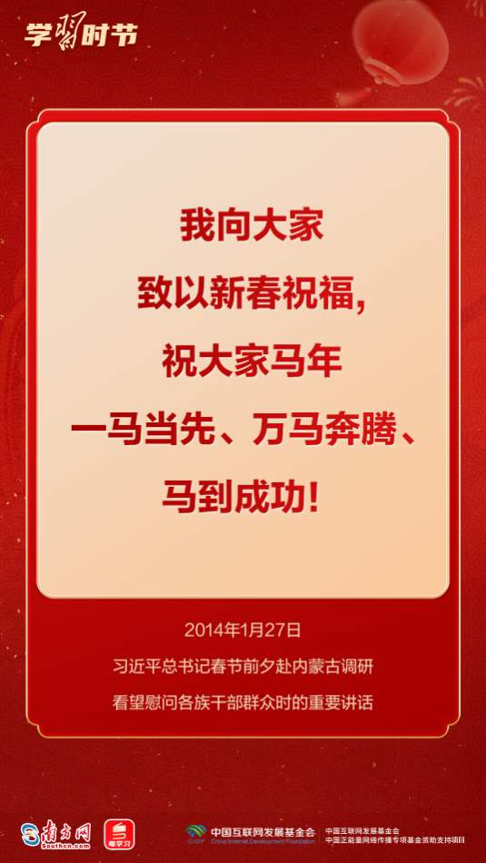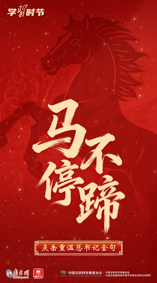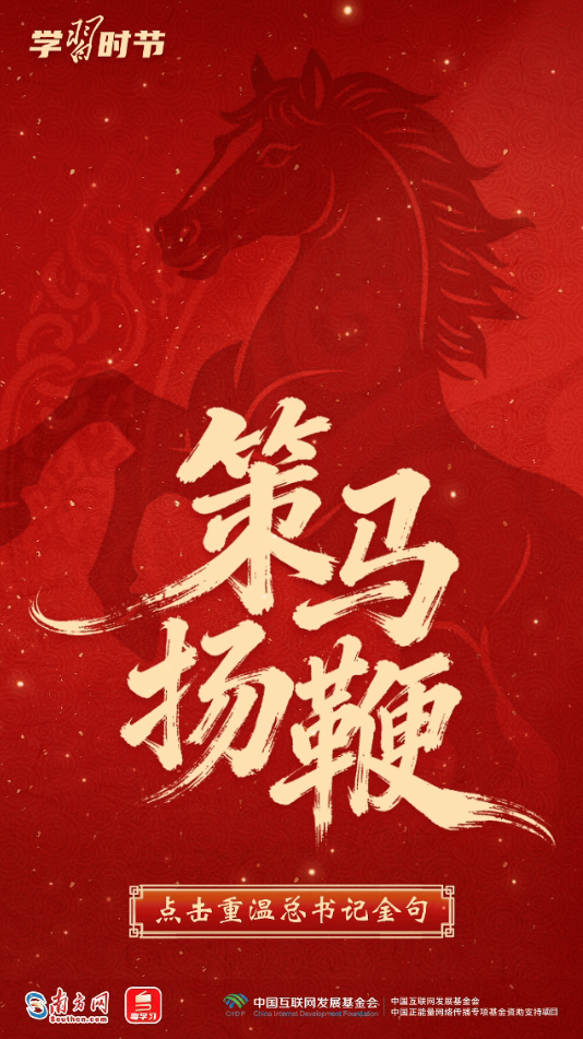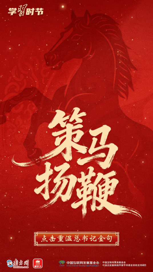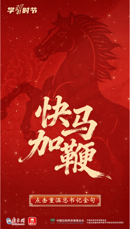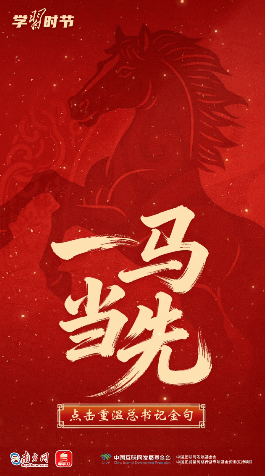 習(xí)近平總書記多次用“龍馬精神”“馬到功成”“一馬當(dāng)先”等耳熟能詳?shù)某烧Z(yǔ),向全國(guó)各族人民送上最美好的新春祝福,寄予奮進(jìn)向上的殷殷囑托。馬年新春,來(lái)接收總書記的祝福和寄語(yǔ),一起策馬揚(yáng)鞭,奔向更美好的明天!