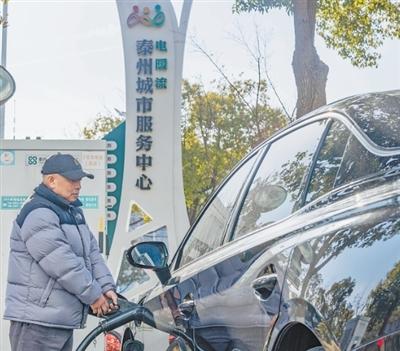 我國建成全球最大電動汽車充電網絡。這是一位車主在江蘇泰州市的一個電動汽車快充站內為車輛充電。