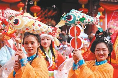 安徽合肥市新春文化廟會的魚燈巡游。