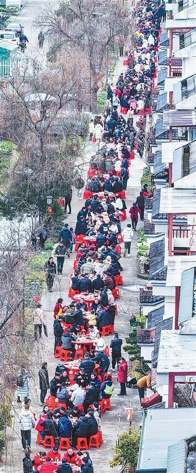 浙江建德市蓮花鎮戴家村,當地群眾與外地游客品嘗百家宴。