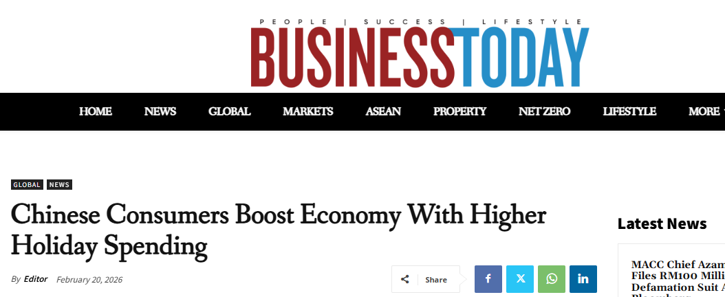 馬來西亞《今日商業(yè)》近日發(fā)表題為《春節(jié)消費熱潮涌動 中國經(jīng)濟活力迸發(fā)》的文章,聚焦中國春節(jié)假期消費。
