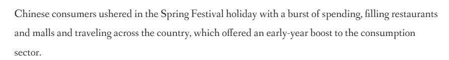 文章說,中國在春節(jié)期間迎來消費熱潮,餐廳、商場人頭攢動,全國旅游市場火爆,為消費市場實現(xiàn)“開門紅”注入強勁動力。