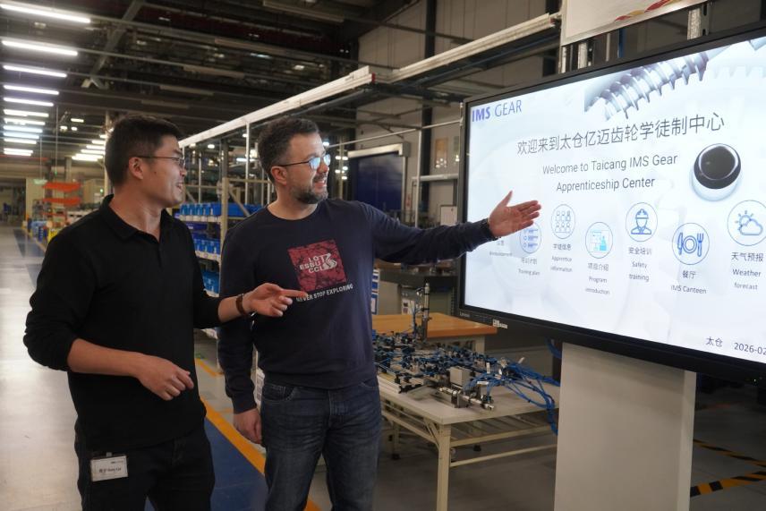 2026年2月24日,培訓師托馬斯(右)在億邁齒輪(太倉)有限公司講解雙元制培訓。(圖片來源:新華社)