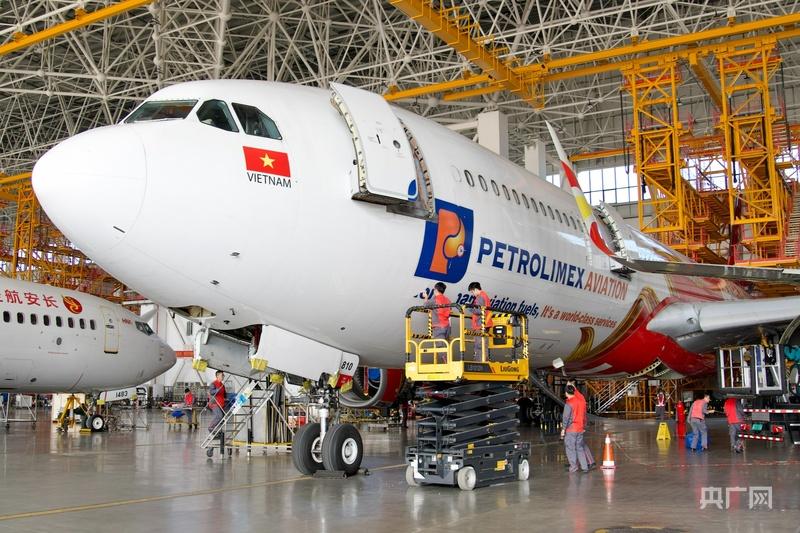 海南自貿(mào)港一站式飛機(jī)維修產(chǎn)業(yè)基地工作人員對(duì)進(jìn)境飛機(jī)執(zhí)行檢修(央廣網(wǎng)記者 蔡文娟 攝)