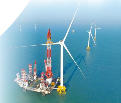 位于福建閩南海域的“大橋海風”號2000噸自升式海上風電安裝平臺和20兆瓦風電機組吊裝現場俯瞰。